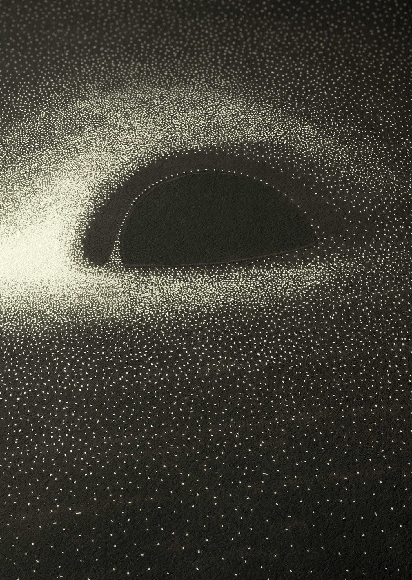 In 1979, French astrophysicist Jean-Pierre Luminet produced the first computer-generated visualization of a black hole surrounded by an accretion disk. Utilizing an IBM 7040 mainframe computer, he calculated the gravitational effects of a black hole on light from the accretion disk. Luminet then meticulously hand-drew the resulting image using India ink on negative paper, creating a detailed representation of the black hole’s appearance.