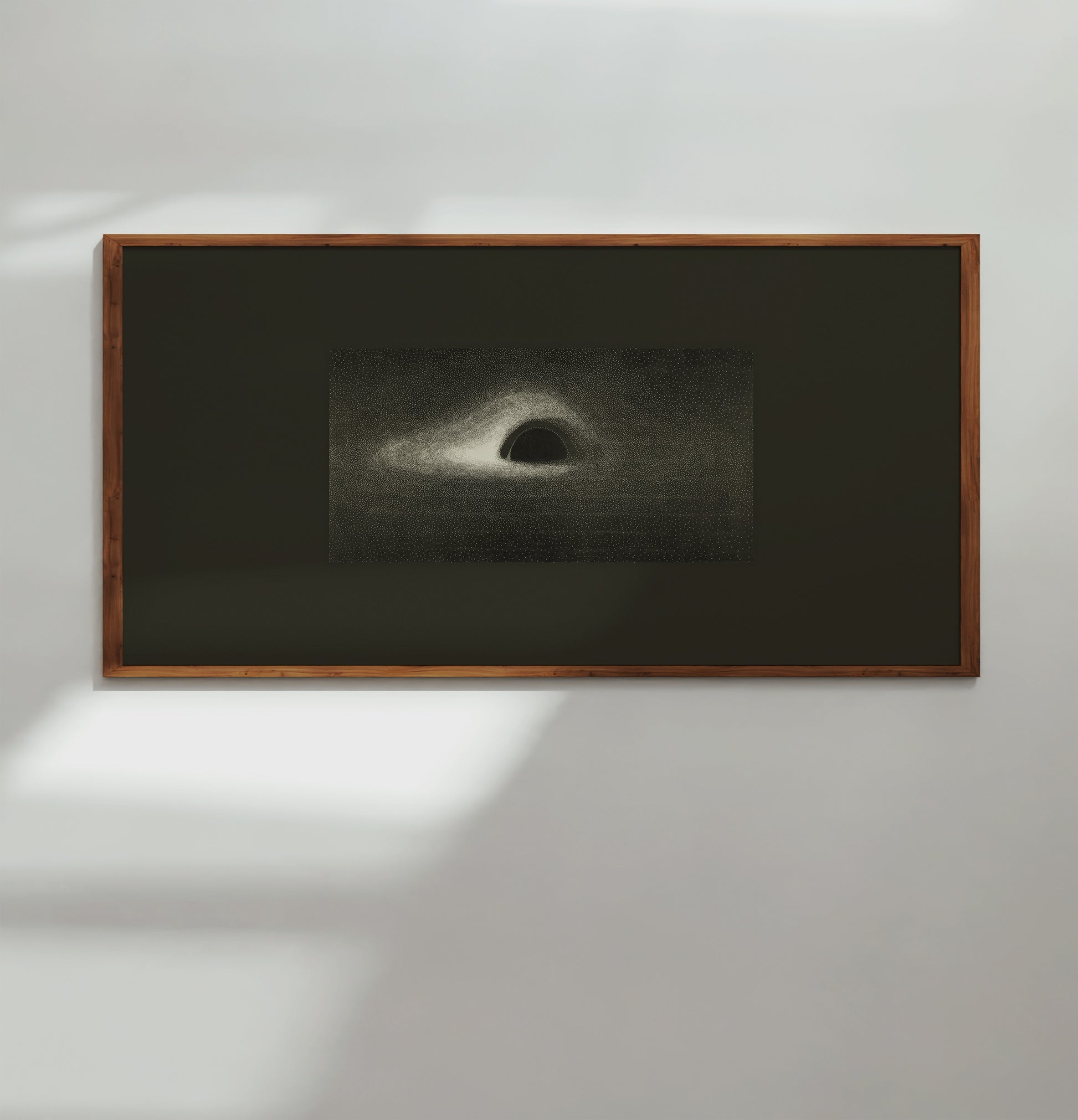 With its surreal, otherworldly glow, the print reveals an intense accretion disk bending under extreme forces. A blend of scientific precision and aesthetic wonder, this piece brings viewers to the precipice of the unknown, inviting contemplation of space-time’s most enigmatic depths.